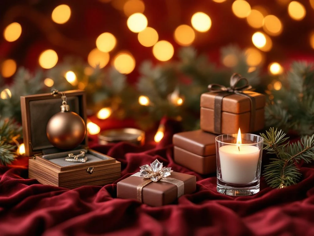 Luxe kerstcadeaus op bordeauxrood fluweel met gouden verlichting: sieradendoos, ornament, kaars, leren accessoire