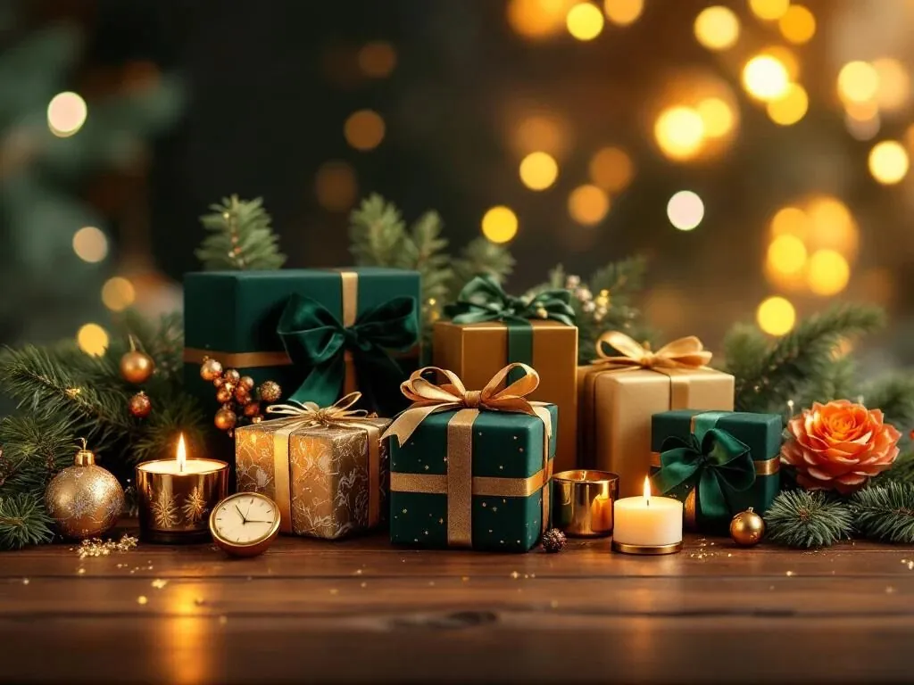 Zeven luxe kerstcadeaus in groen en goud op mahoniehout met warme verlichting en pijnboomtakken