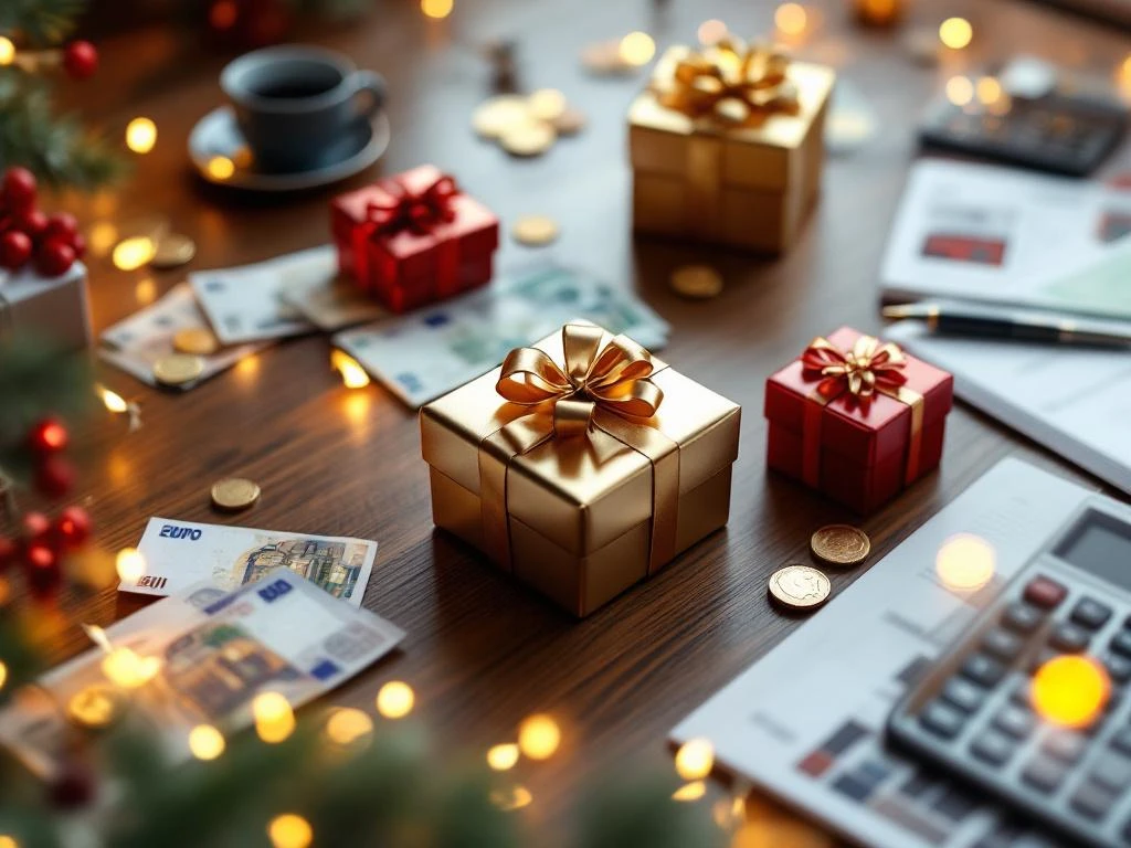 Luxe kerstcadeaus in goud en zilver op mahonie bureau met eurobiljetten en calculator voor zakelijke planning