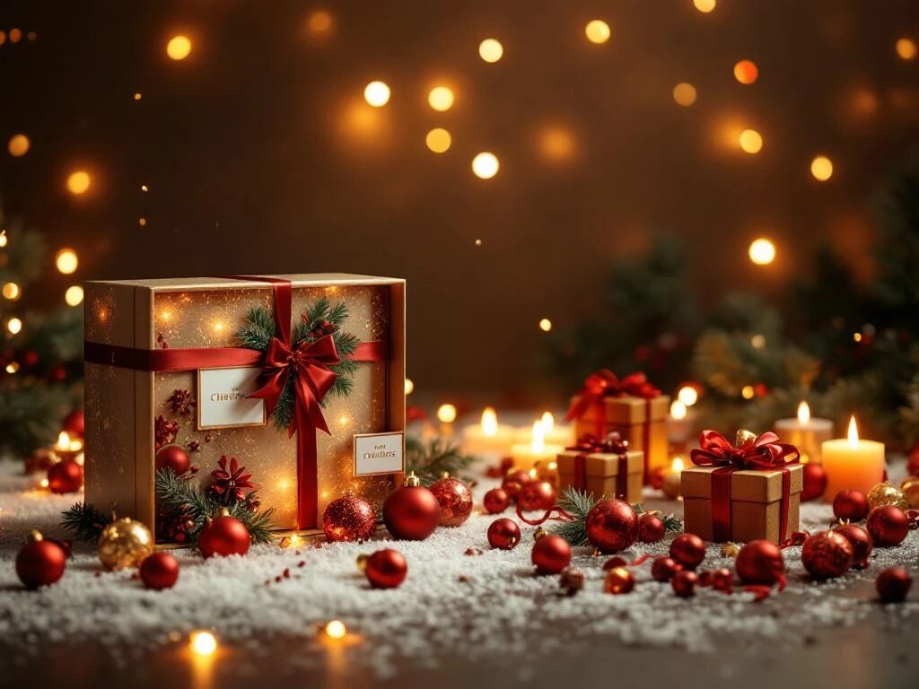 Luxe kerst cadeauset in presentatiebox naast losse kerstversieringen, warm verlicht met rood-groene kerstkleuren