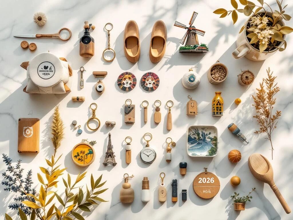 Moderne 2026 souvenirs op wit marmer: eco-vriendelijke bamboe sleutelhangers, gerecycled glas en Nederlandse klompen